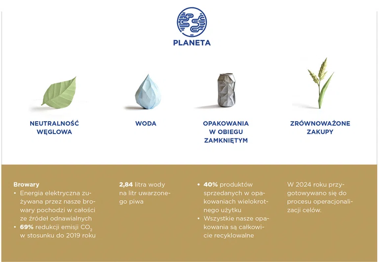 Dążymy do neutralności pod względem emisji dwutlenku węgla w naszych browarach oraz współpracujemy z partnerami, aby do 2030 roku zmniejszyć ślad węglowy w całym łańcuchu dostaw o 30%. Choć jesteśmy pod tym względem jednym z europejskich liderów, nieustannie pracujemy nad dalszą redukcją zużycia wody w produkcji piwa. Stawiamy także na odpowiedzialne opakowania – już dziś są one wielokrotnego użytku lub w pełni nadają się do recyklingu. Naszym celem jest, aby wszystkie spełniały założenia gospodarki o obiegu zamkniętym. Do 2030 roku zobowiązujemy się wykorzystywać w produkcji wyłącznie składniki pozyskiwane w sposób zrównoważony środowiskowo.